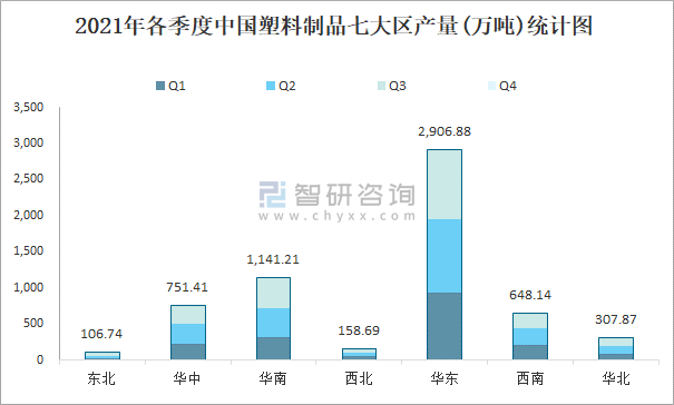 2021年各季度中國塑料制品七大區產量統計圖