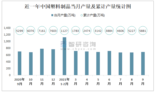 根據國家統計局數據顯示:2021年9月中國塑料制品產量為690萬噸,同比下降4.1%;2021年1-9月中國塑料制品累計產量為5881.1萬噸,累計增長9.3%;2015-2020年中國塑料制品產量2019年達到最高,此后有所下滑。