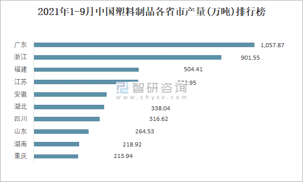 2021年1-9月中國塑料制品各省市產量排行榜