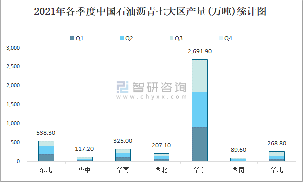 根據國家統計局數據顯示:2021年各季度中國石油瀝青主要集中在華東、東北、華南地區生產;2021年1-9月中國石油瀝青產量大區分布不均衡,其中華東地區產量最高,特別是山東省貢獻了最多產量;2021年1-9月中國石油瀝青各省市產量top1遙遙領先于其他前9名。