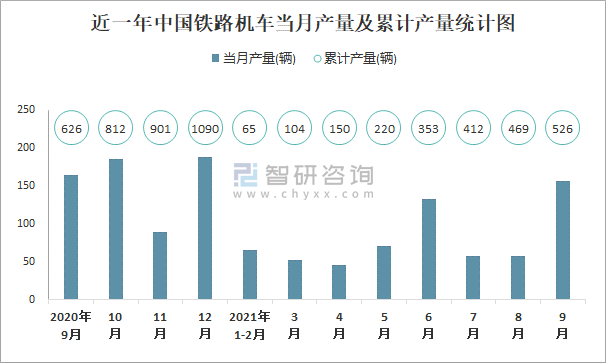 根據國家統計局數據顯示:2021年9月中國鐵路機車產量為157輛,同比增長1.3%;2021年1-9月中國鐵路機車累計產量為526輛,累計下降9.9%;2015-2020年中國鐵路機車產量2015年達到最高,此后總體呈現下降趨勢。