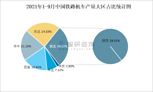 2021年1-9月中國鐵路機車產量大區占比統計圖