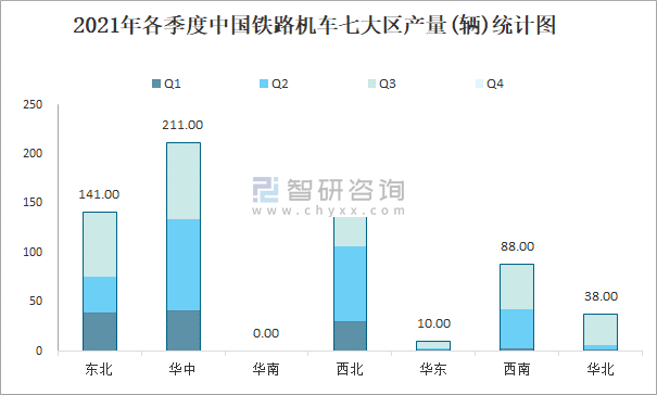2021年各季度中國鐵路機車七大區產量統計圖