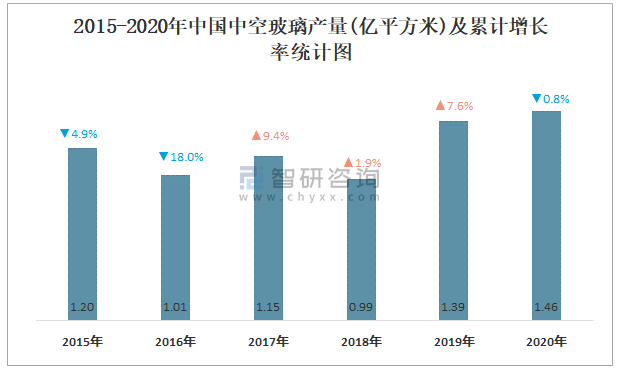 2015-2020年中國中空玻璃產量及累計增長率統計圖