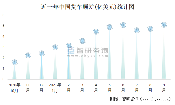 近一年中國貨車順差(億美元)統計圖