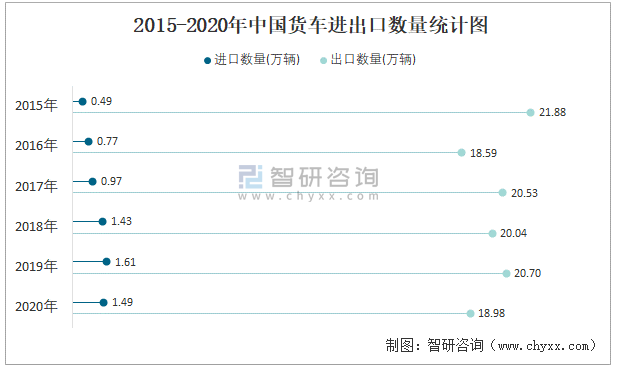 2015-2020年中國貨車進出口數量統計圖