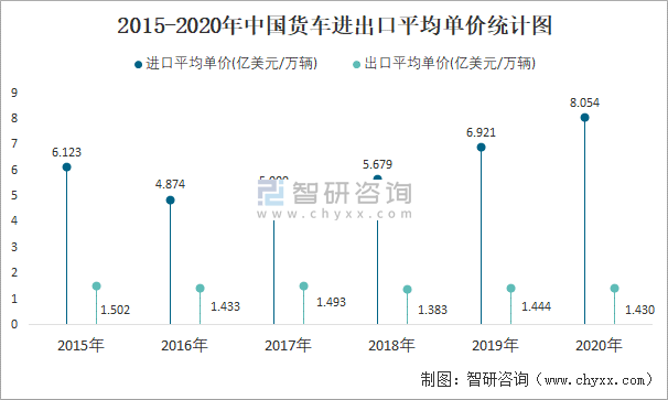 2015-2020年中國貨車進出口平均單價統計圖