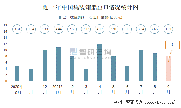 根據中國海關數據顯示:2021年9月中國集裝箱船出口數量為8艘,同比增長60%,出口金額為1.71億美元,同比下降36.9%;2021年1-9月中國集裝箱船出口數量為75艘,出口金額為26.38億美元。