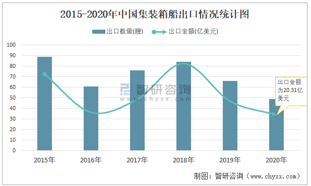 2015-2020年中國集裝箱船出口情況統計圖
