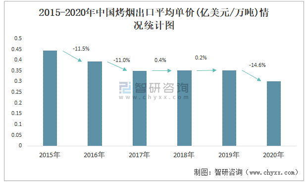 2015-2020年中國烤煙出口平均單價(億美元/萬噸)情況統計圖