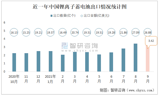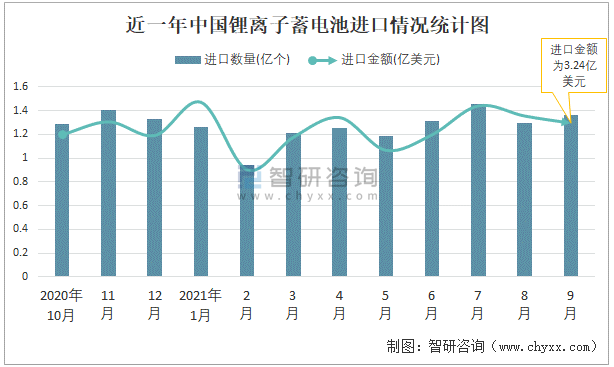 根據中國海關數據顯示:2021年9月中國鋰離子蓄電池進口數量為1.36億個,同比下降3.6%,進口金額為3.24億美元,同比下降0.5%,2021年9月中國鋰離子蓄電池出口數量為3.42億個,同比增長41.7%,出口金額為26.88億美元,同比增長61.5%;2021年1-9月中國鋰離子蓄電池進口數量為11.28億個,進口金額為28.13億美元,出口數量為23.6億個,出口金額為190.47億美元。
