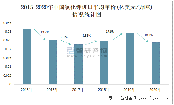 2015-2020年中國氯化鉀進(jìn)口平均單價(jià)(億美元/萬噸)情況統(tǒng)計(jì)圖