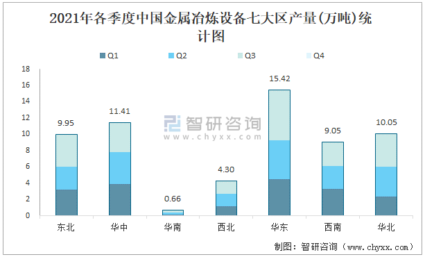 2021年各季度中國金屬冶煉設(shè)備七大區(qū)產(chǎn)量統(tǒng)計圖