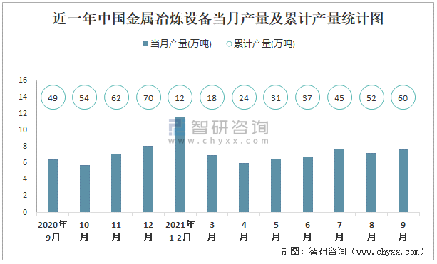 根據(jù)國家統(tǒng)計局?jǐn)?shù)據(jù)顯示:2021年9月中國金屬冶煉設(shè)備產(chǎn)量為17.7萬噸,同比增長158.4%;2021年1-9月中國金屬冶煉設(shè)備累計產(chǎn)量為70.1萬噸,累計增長37.7%;2015-2020年中國金屬冶煉設(shè)備產(chǎn)量近兩年呈上升趨勢。