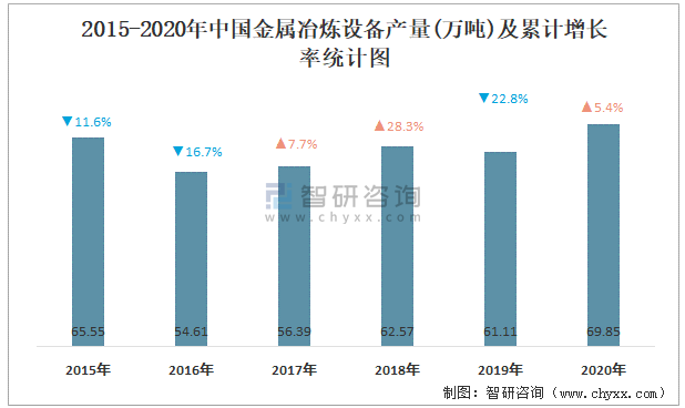 2015-2020年中國金屬冶煉設(shè)備產(chǎn)量及累計增長率統(tǒng)計圖