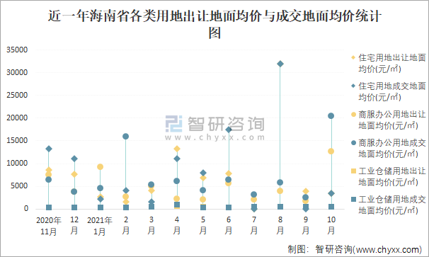 近一年海南省各類用地出讓地面均價與成交地面均價統(tǒng)計圖