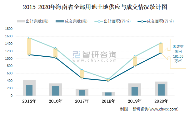 2015-2020年海南省全部用地土地供應(yīng)與成交情況統(tǒng)計圖
