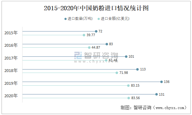 2015-2020年中國奶粉進口情況統計圖