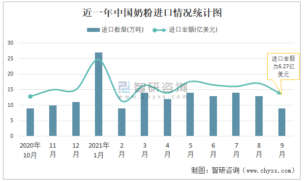 近一年中國奶粉進口情況統計圖