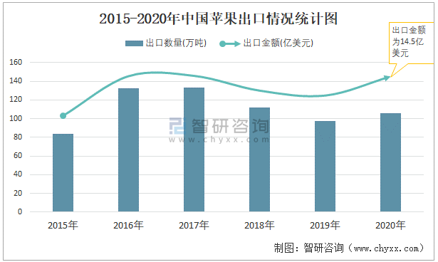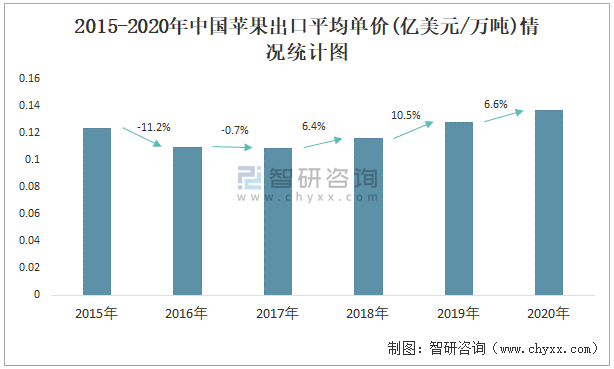 根據中國海關數據顯示:2015-2020年中國蘋果出口數量與出口金額均在2017年達到最高值,此后有所下降;2015-2020年中國蘋果出口平均單價2019年增長速度最快,而2016年中國蘋果出口平均單價下降速度最快,下滑了11.2%。