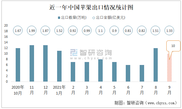 根據中國海關數據顯示:2021年9月中國蘋果出口數量為10萬噸,同比下降14.7%,出口金額為1.33億美元,同比下降21.7%;2021年1-9月中國蘋果出口數量為72萬噸,出口金額為9.89億美元。