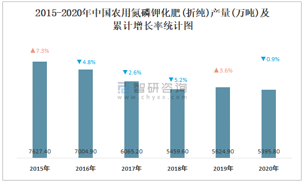 2015-2020年中國農用氮磷鉀化肥(折純)產量及累計增長率統計圖