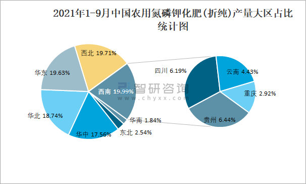 2021年1-9月中國農用氮磷鉀化肥(折純)產量大區占比統計圖