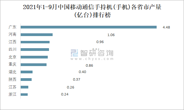 2021年1-9月中國移動(dòng)通信手持機(jī)(手機(jī))各省市產(chǎn)量排行榜