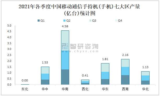 2021年各季度中國移動(dòng)通信手持機(jī)(手機(jī))七大區(qū)產(chǎn)量統(tǒng)計(jì)圖