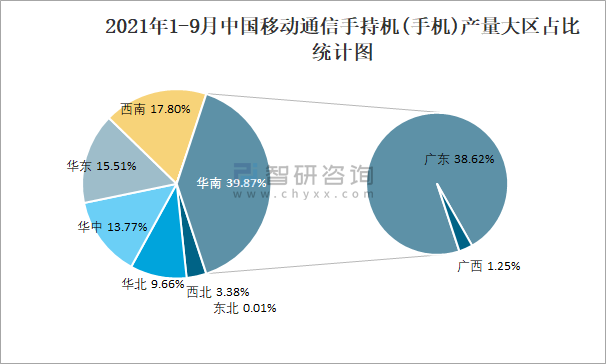 2021年1-9月中國移動(dòng)通信手持機(jī)(手機(jī))產(chǎn)量大區(qū)占比統(tǒng)計(jì)圖