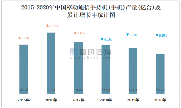 2015-2020年中國移動(dòng)通信手持機(jī)(手機(jī))產(chǎn)量及累計(jì)增長(zhǎng)率統(tǒng)計(jì)圖