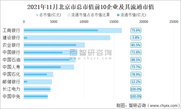 2021年11月北京市A股上市總市值前10強企業及其流通市值