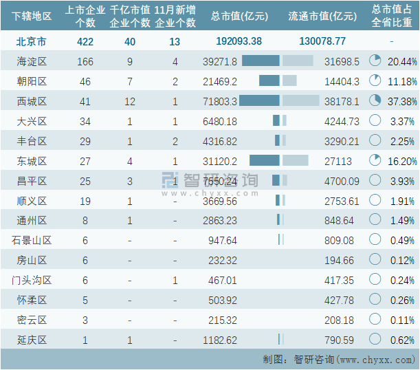 據同花順統計數據可知:11月北京市新增13家企業在A股上市,截止至2021年11月30日,北京市的A股上市企業共計422家,上市企業數量排名全國第4,總市值共計192093.39億元;除平谷區1個市轄區以外,北京市其他15個市轄區均有企業在A股上市,其中海淀區上市企業數量最多,為166家;北京市的A股上市千億市值企業數量在全國排名第1,共計40家,分布在東城區、西城區、朝陽區、豐臺區、海淀區、順義區、通州區、大興區、昌平區、延慶區10個地區,其中西城區千億市值企業最多,為12家;西城區A股上市企業總市值總流通市值均為最高。