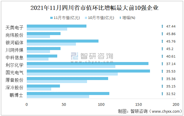 2021年11月四川省A股上市企業市值環比增幅最大前10強企業