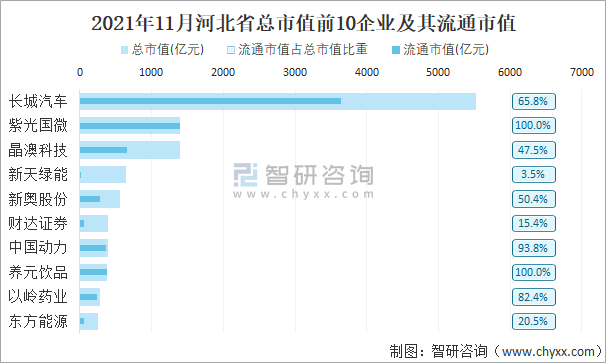 2021年11月河北省A股上市總市值前10強企業及其流通市值
