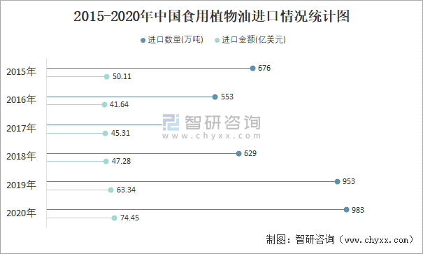 2015-2020年中國(guó)食用植物油進(jìn)口情況統(tǒng)計(jì)圖