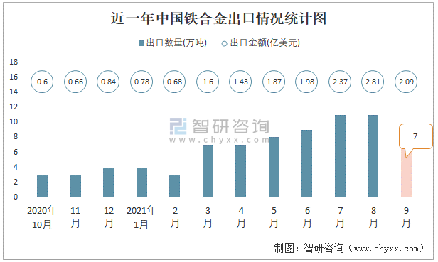 近一年中國鐵合金出口情況統計圖