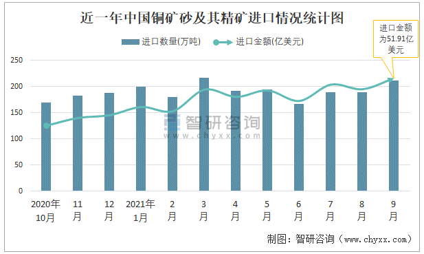 根據(jù)中國海關(guān)數(shù)據(jù)顯示:2021年9月中國銅礦砂及其精礦進口數(shù)量為211萬噸,同比下降1.2%,進口金額為51.91億美元,同比增長38.3%,2021年1-9月中國銅礦砂及其精礦進口數(shù)量為1737萬噸,進口金額為417.53億美元。
