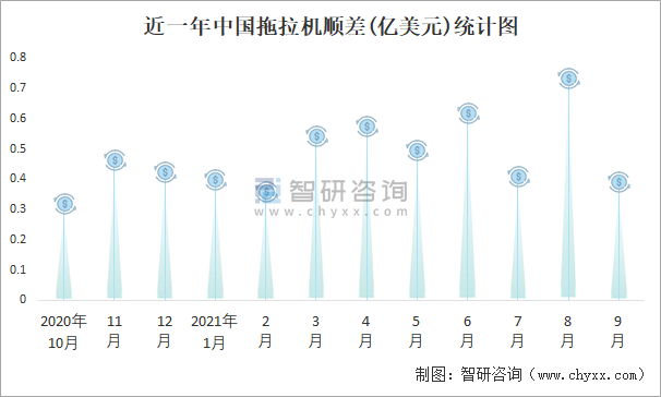 根據中國海關數據顯示:近一年中國拖拉機進口金額總體小于出口金額,進出口貿易全部為順差,順差規模在8月達到最大,9月大幅度縮減。
