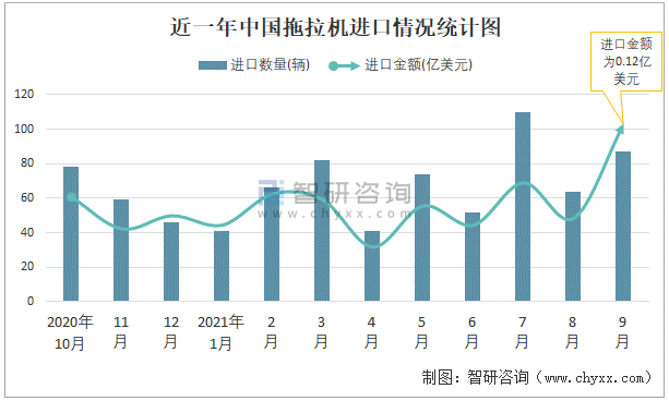 根據中國海關數據顯示:2021年9月中國拖拉機進口數量為87輛,同比下降0%,進口金額為0.12億美元,同比增長24.9%,2021年9月中國拖拉機出口數量為9344輛,同比下降15.6%,出口金額為0.51億美元,同比增長18.6%;2021年1-9月中國拖拉機進口數量為617輛,進口金額為0.6億美元,出口數量為101533輛,出口金額為5.12億美元。