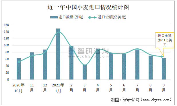 根據中國海關數據顯示:2021年9月中國小麥進口數量為64萬噸,同比下降40.4%,進口金額為2.1億美元,同比下降28.2%,2021年1-9月中國小麥進口數量為759萬噸,進口金額為23.44億美元。