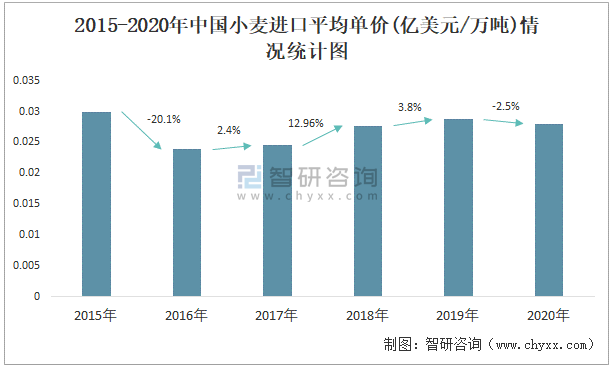 2015-2020年中國小麥進口平均單價(億美元/萬噸)情況統計圖