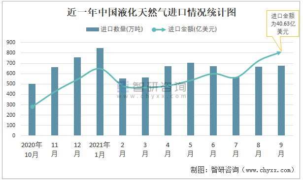根據中國海關數據顯示:2021年9月中國液化天然氣進口數量為675萬噸,同比增長19.2%,進口金額為40.63億美元,同比增長174.1%,2021年1-9月中國液化天然氣進口數量為5848萬噸,進口金額為263.93億美元。