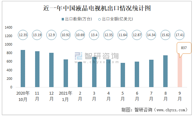 根據(jù)中國(guó)海關(guān)數(shù)據(jù)顯示:2021年9月中國(guó)液晶電視機(jī)出口數(shù)量為837萬(wàn)臺(tái),同比下降19.6%,出口金額為17.41億美元,同比增長(zhǎng)23.7%;2021年1-9月中國(guó)液晶電視機(jī)出口數(shù)量為6019萬(wàn)臺(tái),出口金額為119.23億美元。