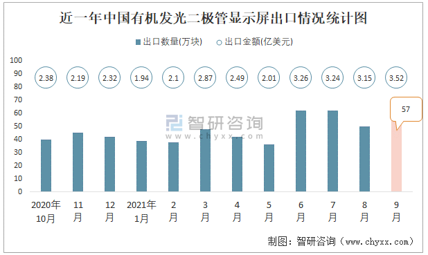 根據中國海關數據顯示:2021年9月中國有機發光二極管顯示屏進口數量為26萬塊,同比增長13.1%,進口金額為1.37億美元,同比增長43.9%,2021年9月中國有機發光二極管顯示屏出口數量為57萬塊,同比增長36.6%,出口金額為3.52億美元,同比增長74.3%;2021年1-9月中國有機發光二極管顯示屏進口數量為273萬塊,進口金額為12.22億美元,出口數量為427萬塊,出口金額為24.38億美元。