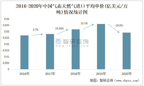 2016-2020年中國氣態天然氣進口平均單價(億美元/萬噸)情況統計圖