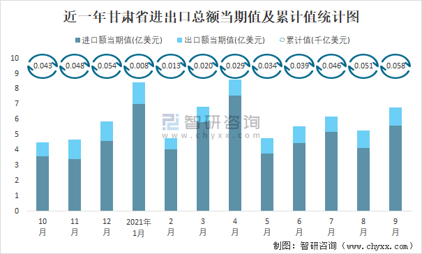 近一年甘肅省進出口總額當期值及累計值統(tǒng)計圖