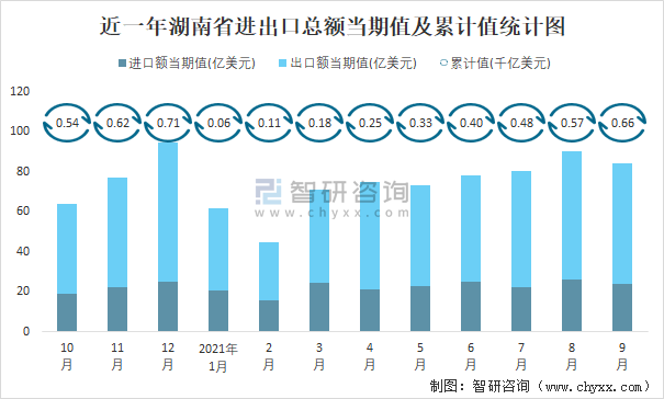 近一年湖南省進出口總額當期值及累計值統計圖