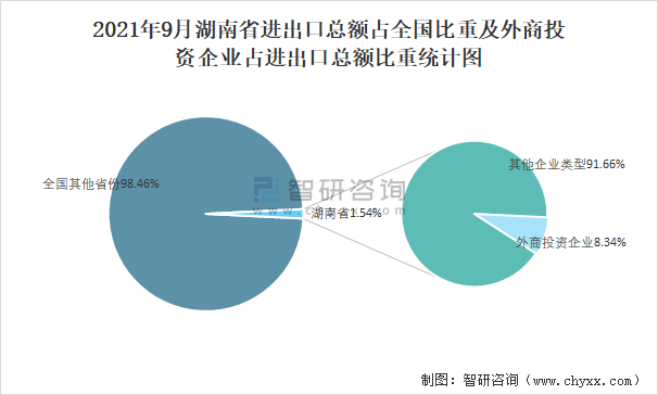 2021年9月湖南省進出口總額占全國比重及外商投資企業占進出口總額比重統計圖
