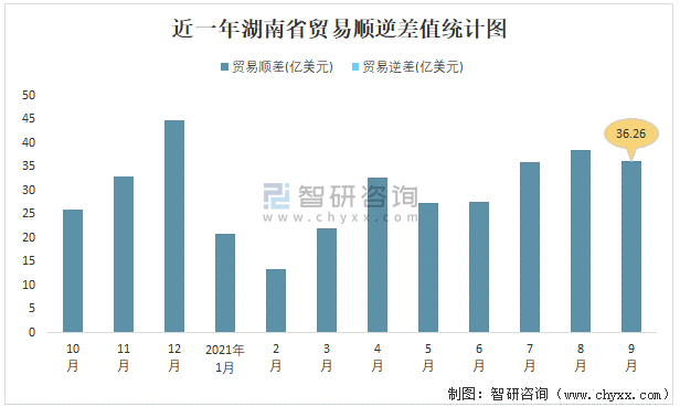 近一年湖南省貿易順逆差值統計圖